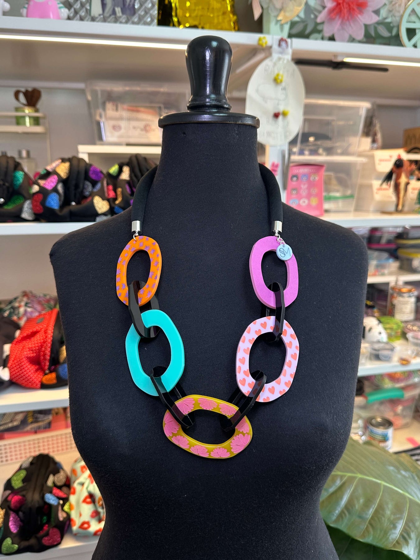 Collar de Acrílico pintado a mano y cuerda de algodón forrada de Dupont.