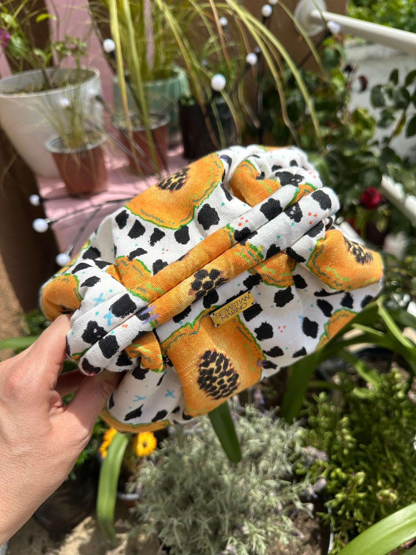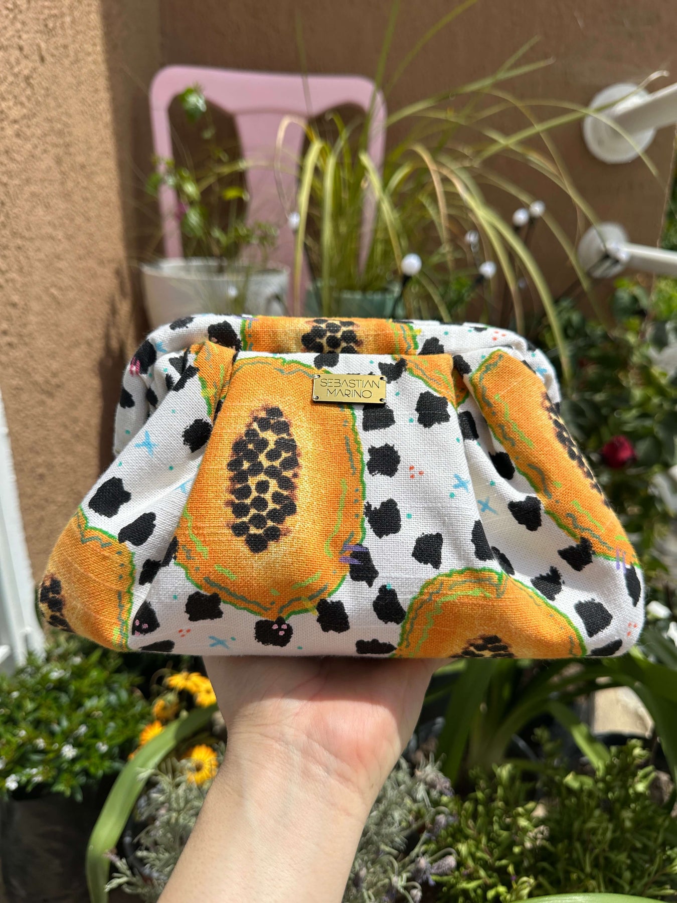Bolso confeccionado a mano en el taller de SM, realizado completamente en algodón, pintado a mano,acolchado y con cierre corchete metálico. Bolsillo interior y strap de cinta mochila desmontable